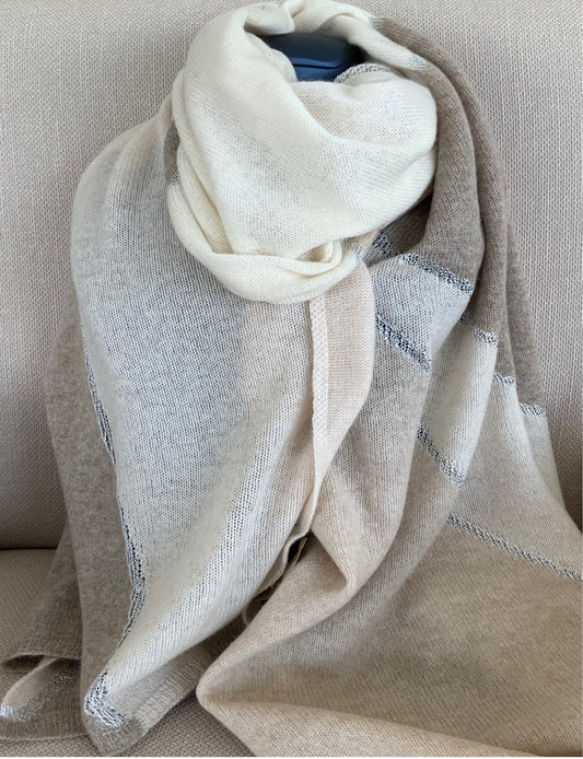 Shawl 100% Cashmere Naturel Shades of Beige Colors with Silver Trim Loro Piana design Great Gift