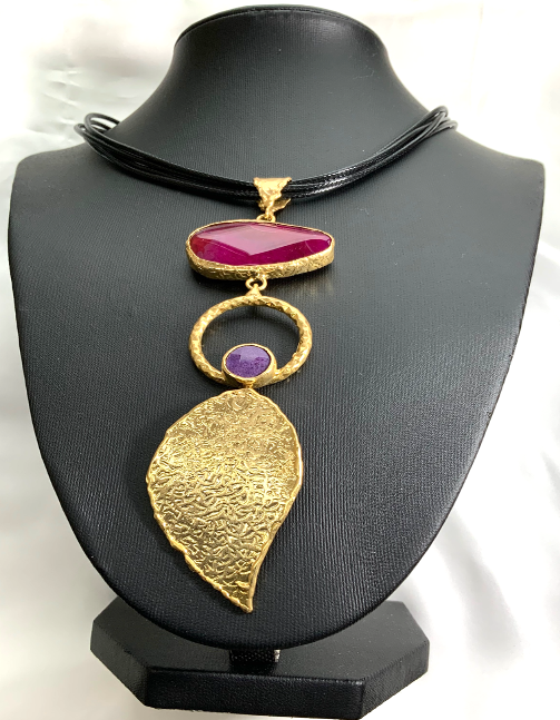 Yellow Gold plated Boho style semi-precious gemstones Cabochon ,Necklace made of alloy material gold plated with Gemstones and Black cord clavicle chain length 40cm long and 4cm of extension chain.Pendant geometric shape 13cm long and 3,5cm width. Handmade all measurement are variable. Free shipping.