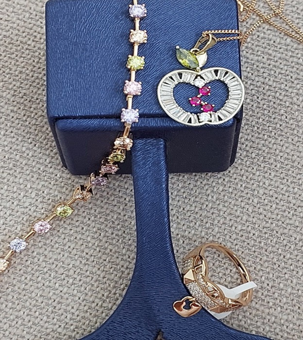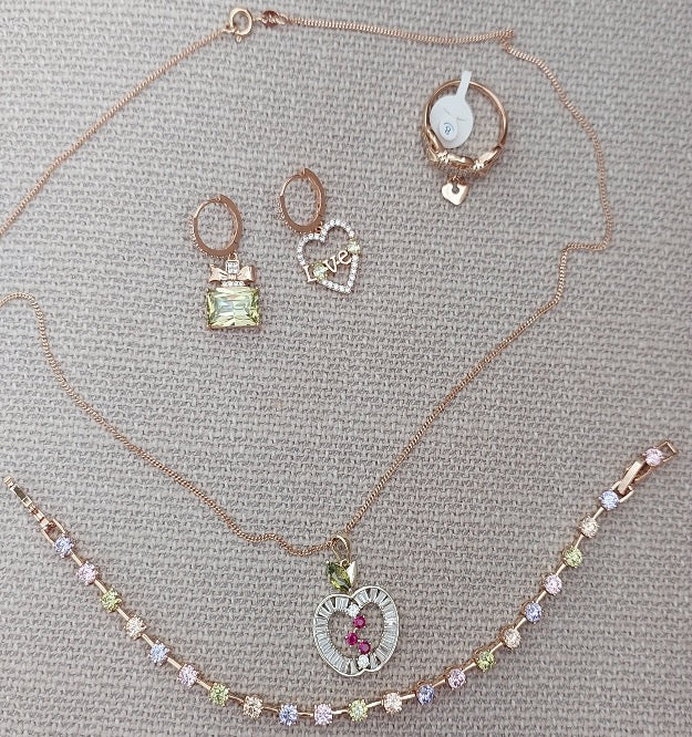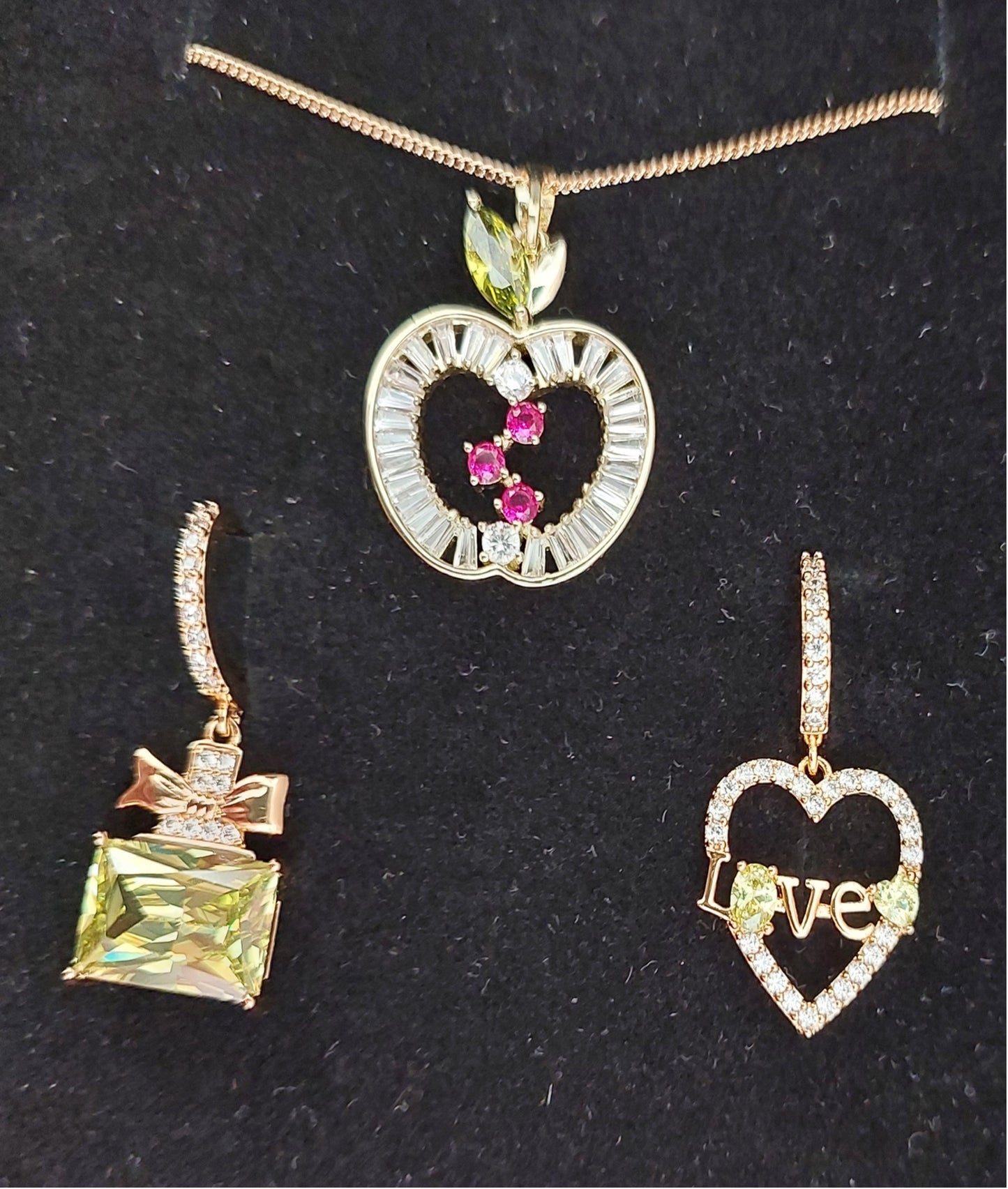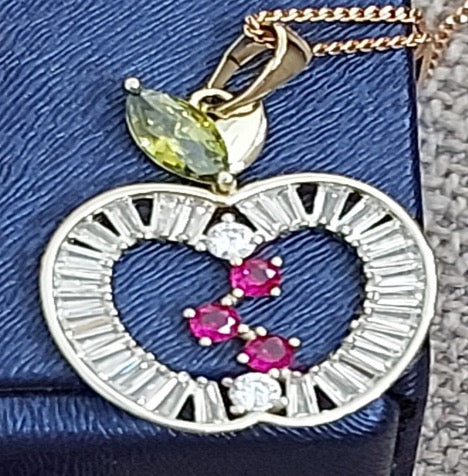 The necklace is made of a chain gold plated with pendant apple design in green diamond zirconia and pink zirconia stones  length 40CM or 20 INCH. and extension of 5 cm=2.5inch