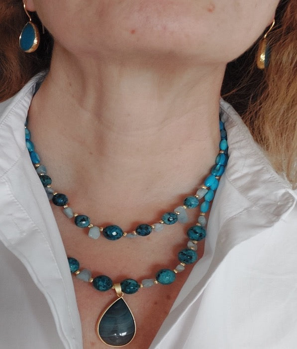 Necklace length: First -40 cm =18 inch with an extension of 5 cm more 2 inch. and a 4 cm pendant. The ring is adjustable with 2 stones shape design .The Bracelet is  adjustable made with blue stones and pearls . The earrings are made with blue apatite stones pear shape bangle. Gemstones: Blue Apatite stones and Pearl