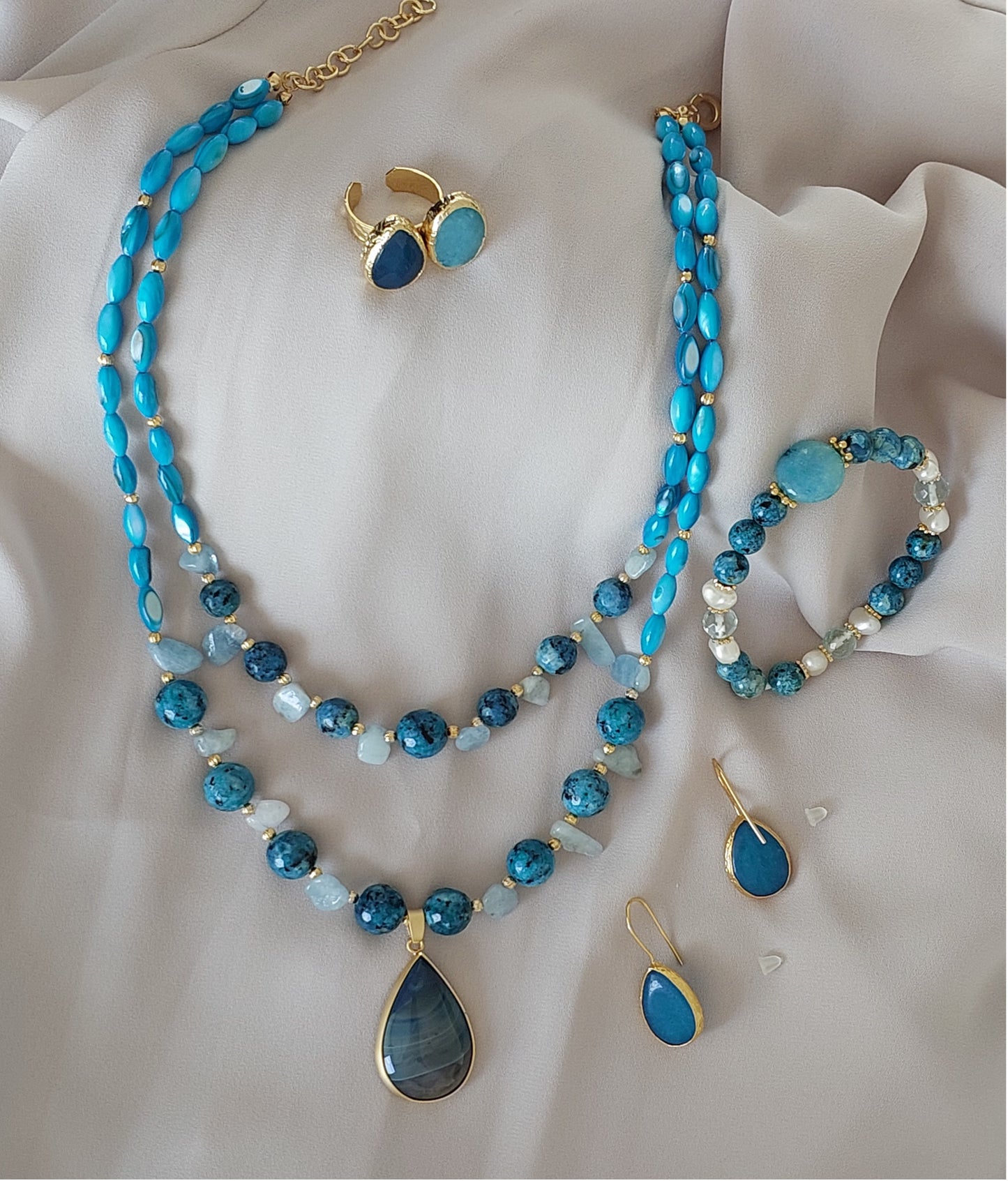 Jewelry Set Double layer Necklace Bracelet Ring Earrings Handmade Gemstones Blue Apatite Stones Great for Gifts 4 pieces