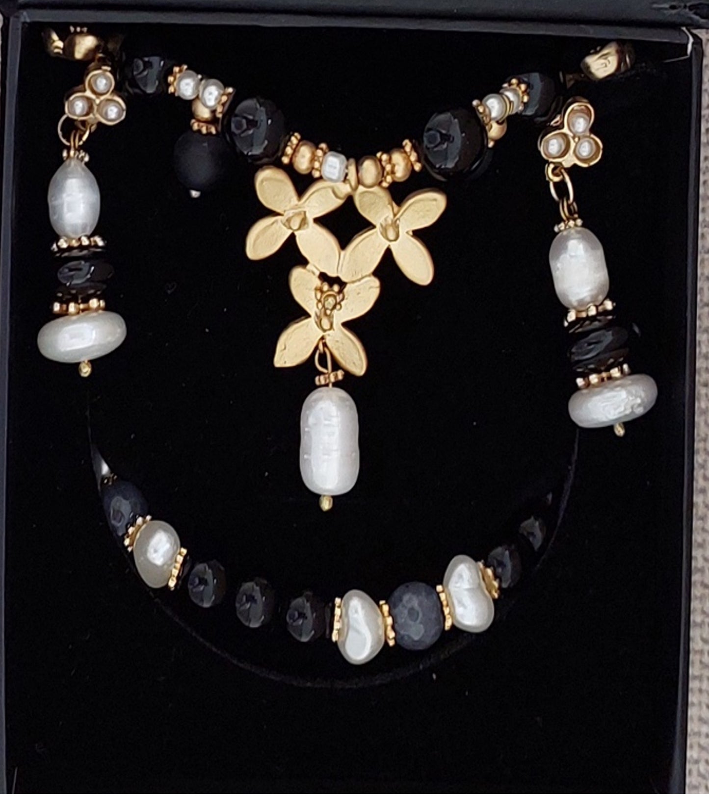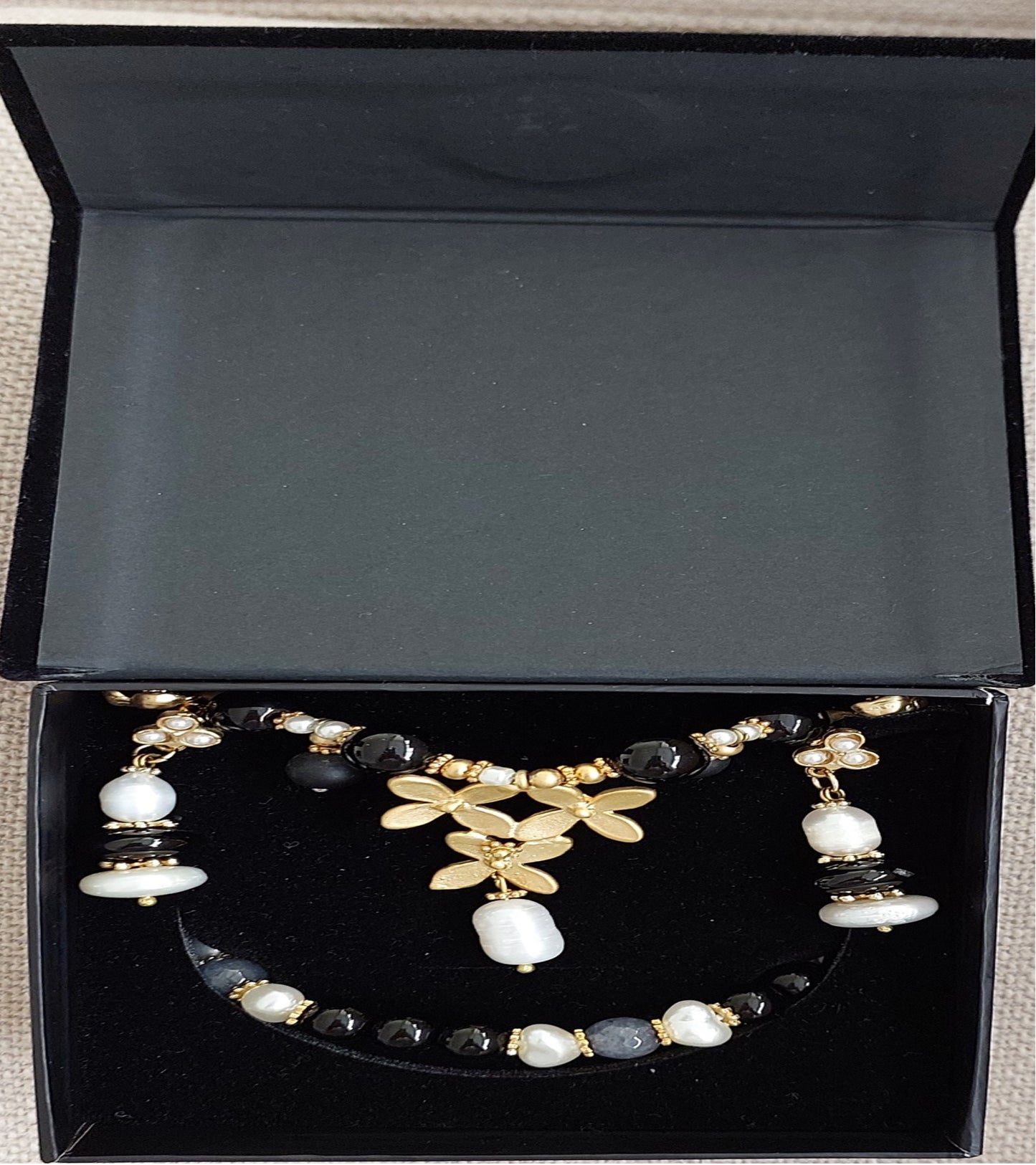 Jewelry Set Necklace Earrings Bracelet Handmade Gemstones Black Onyx Pearl 3 pieces Great Gift for Woman in a box, made of environmental Brass , plated with 18K gold ,necklace made with Black Agate and Onyx stones, and white small Pearls all measurements are variable. Handmade items.