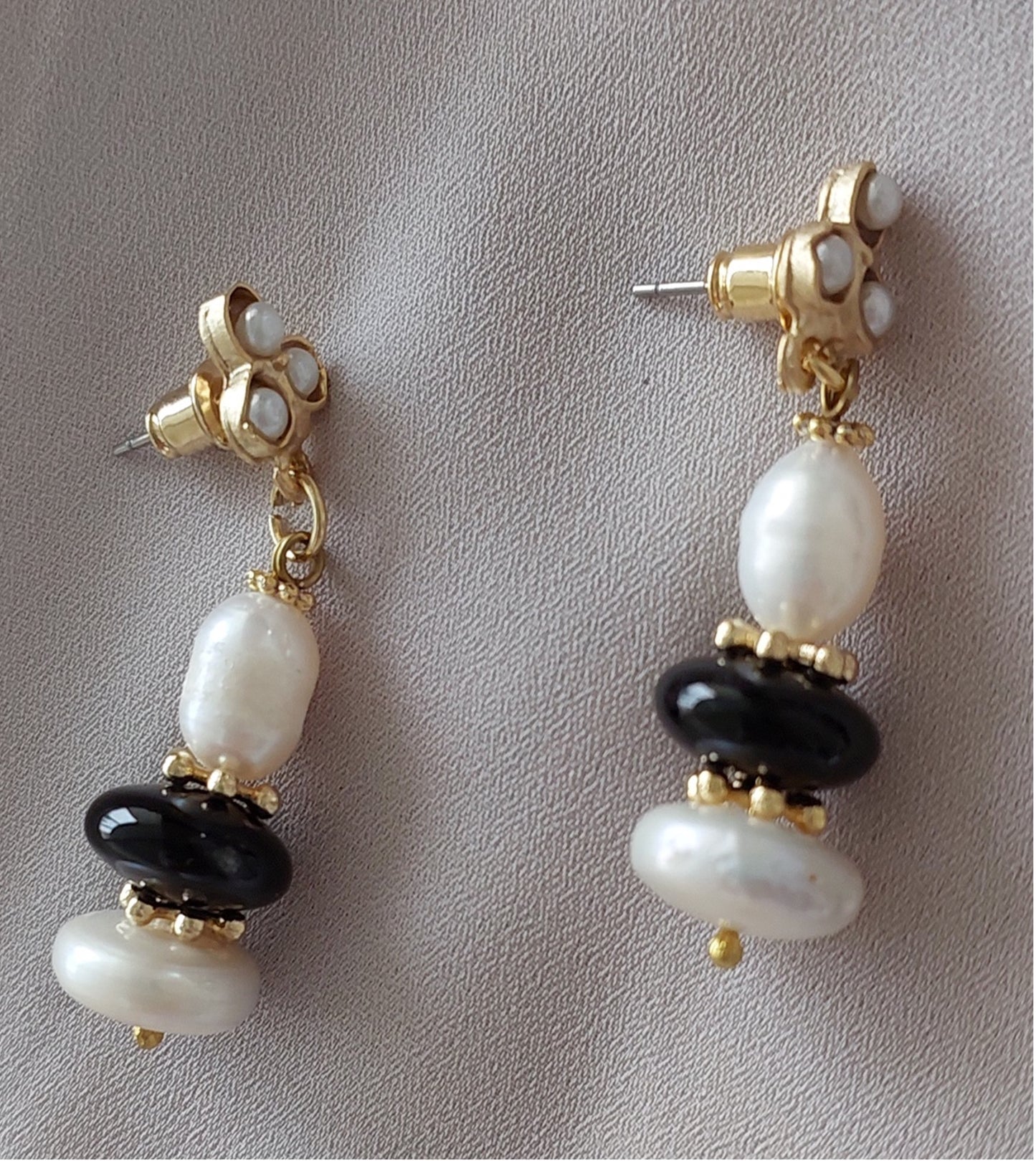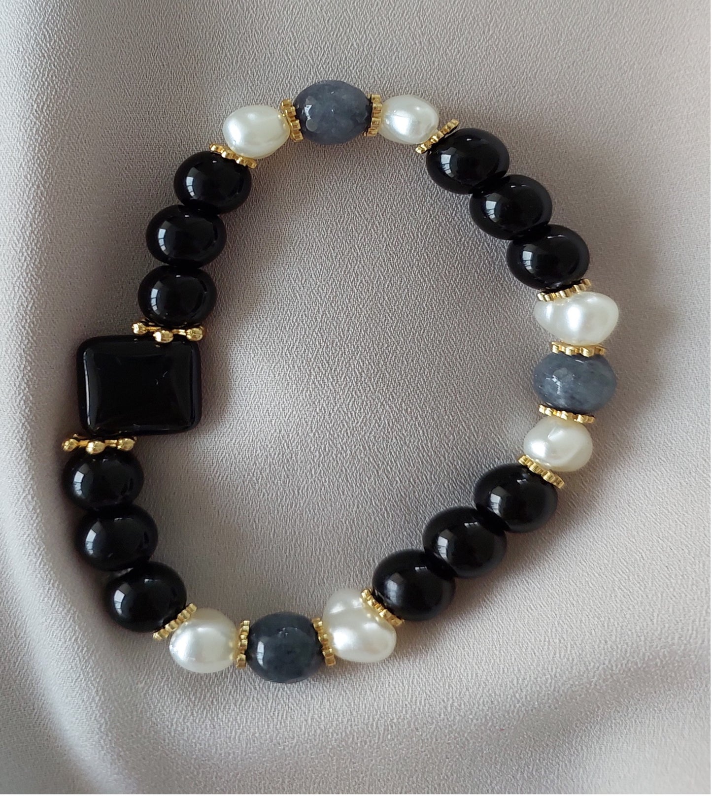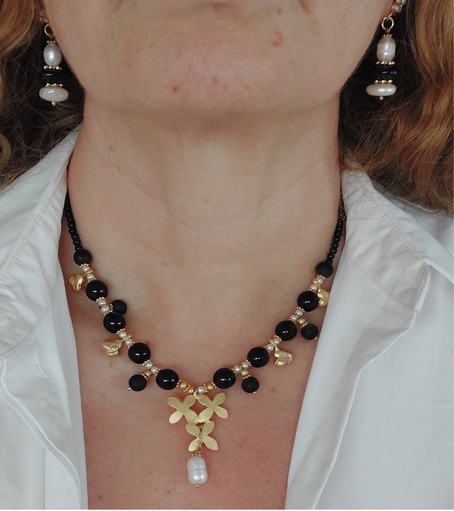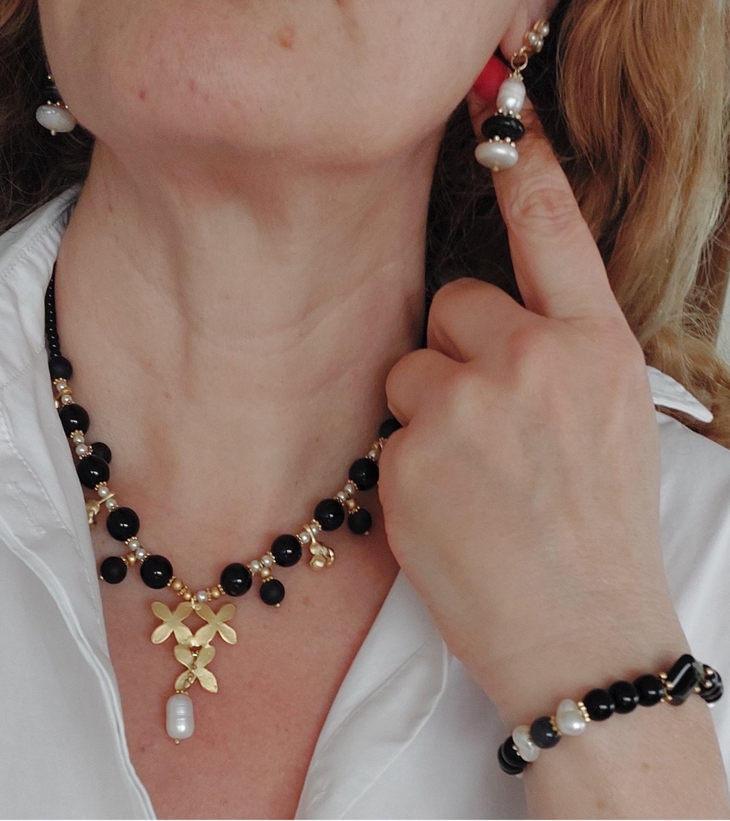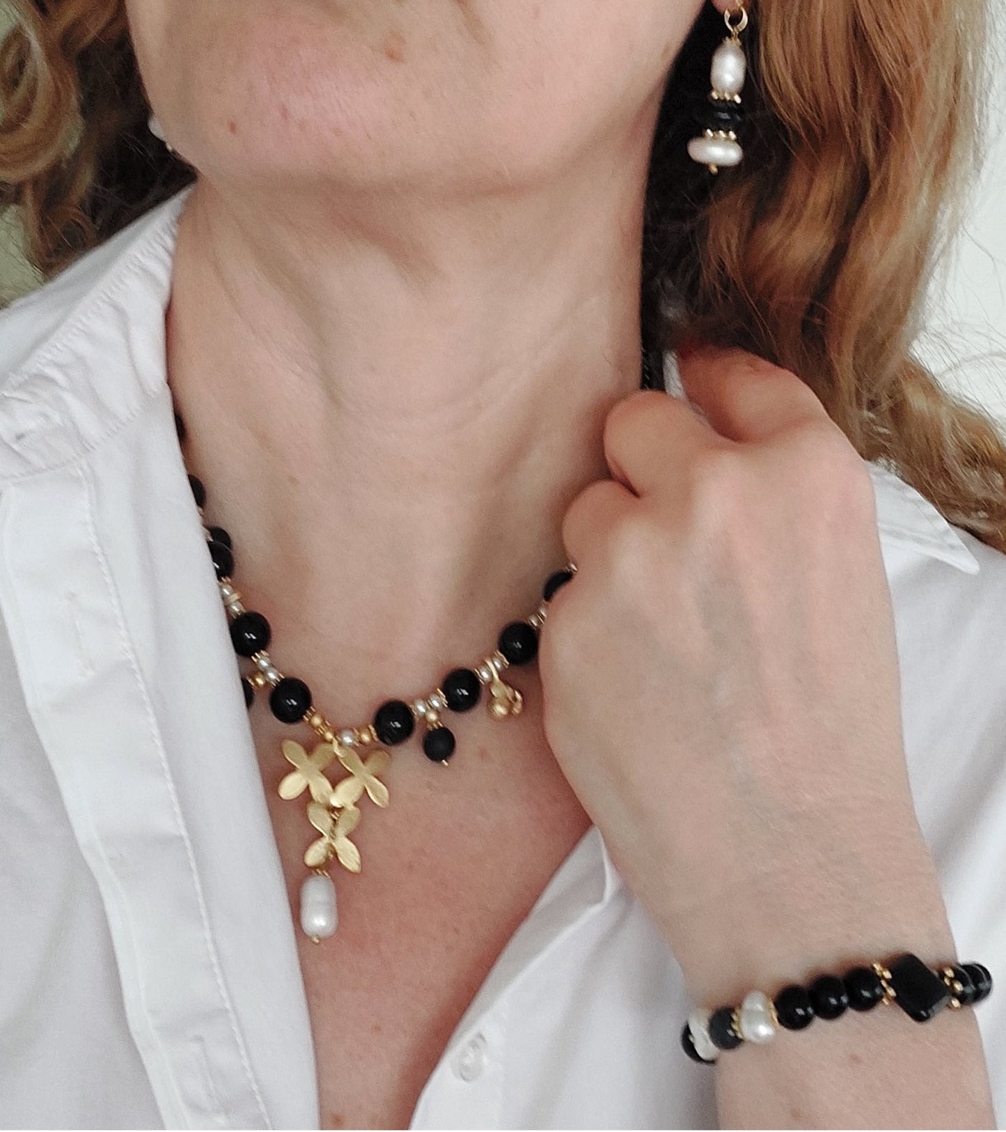 Necklace length: 40cm =18 inch with an extension of 4 cm more 2 inch.  The Bracelet is made with pearl and black stones and is adjustable. Gemstones: Black Agate Onyx and, Pearls.The earrings are made of pearls and black onyx stones.