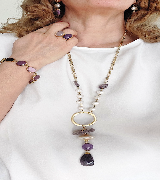 Necklace length: The long Necklace is 80 cm = 30 inch the pendant is 12 cm =5 inch long. The ring is adjustable with 2 Amethyst stones shape design . The Bracelet is made with 7 Purple stones 18 cm= 7 inch with 4cm = 1.5 inch extension. The earrings are made with pearl and Amethyst sugilite stones.