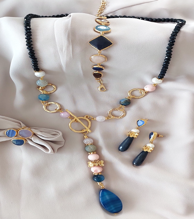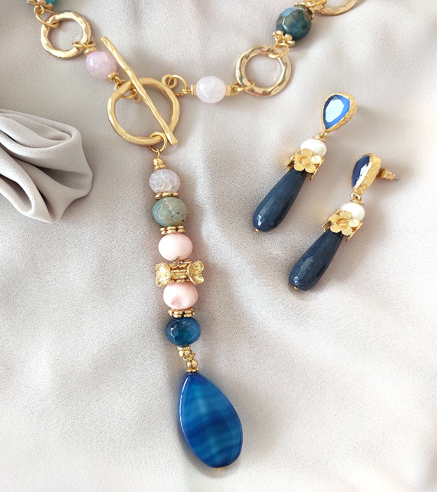 Jewelry Set Necklace Earrings Ring Bracelet Handmade Gemstones Blue Agate Pendant Pink Quartz Pearl 4 pieces Great Gift for Woman made of environmental Brass, plated with 18K gold colour, made with Blue Agate, Blue and Pink Amazonite, Pink Quartz and  Blue Apatite stones, all measurements are variable. Handmade items.