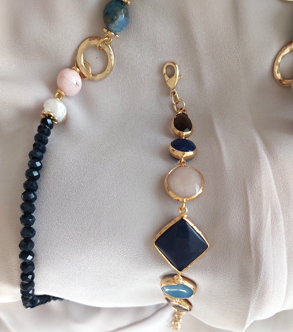• Gemstones: Agate , Amazonite, Quartz and Apatite stones Blue and Pink ,and pearls
