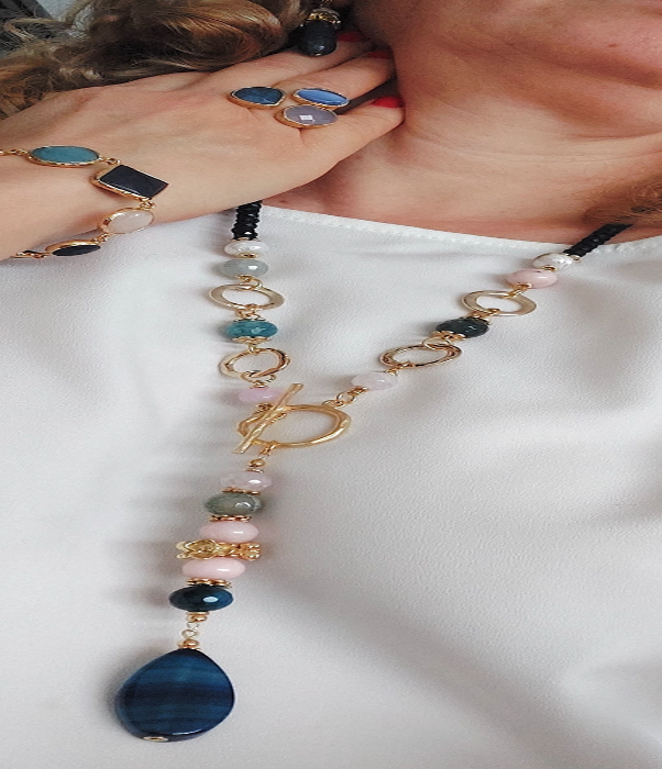 • Necklace length: 68 cm =32 inch with an extension of 2 cm , 1 inch The pendant is 15 cm long. The ring is adjustable made of 3stones Blue agate and Pink Quartz, the bracelet is 20 cm long adjustable made with multiple stones .  the earrings are made with Blue Apatite stones and pearls.