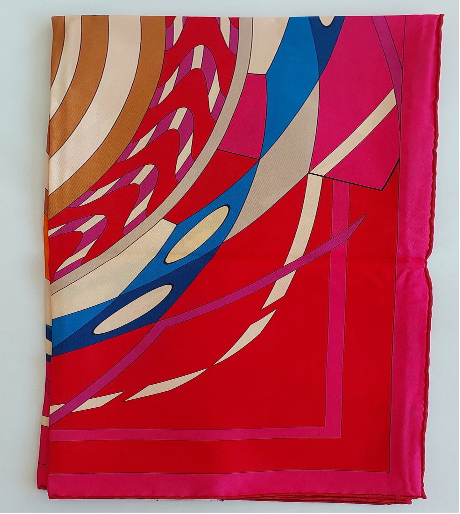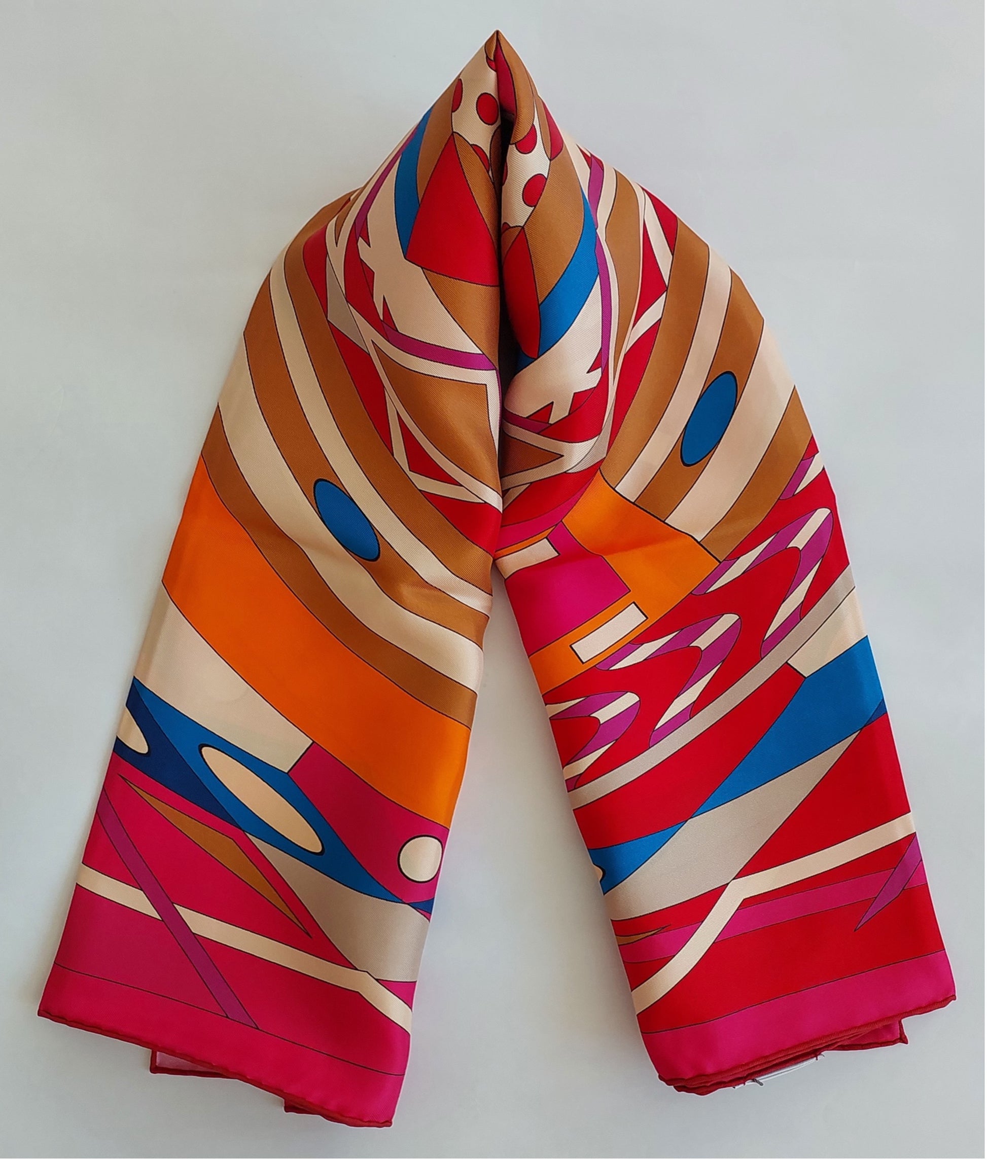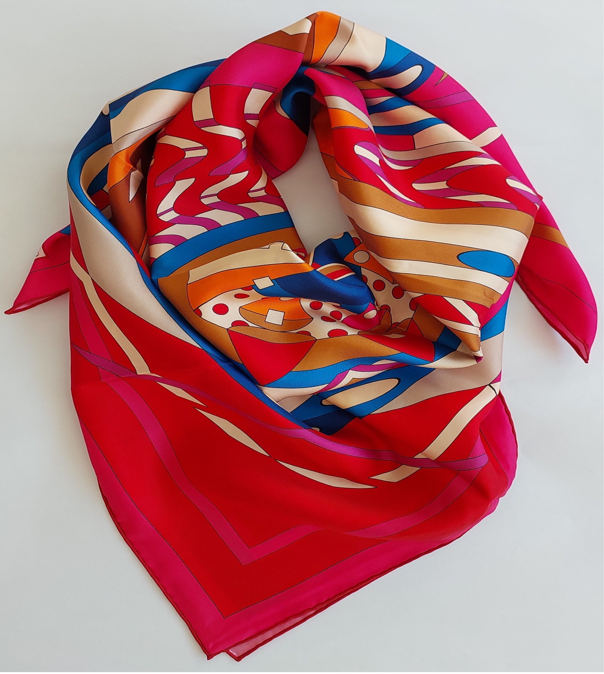 Woman 100% Silk Scarf Geometric design Circles Fuchsia Red Blue Colours Hand Rolled Edges Designer Style Great Gift for Her in a box