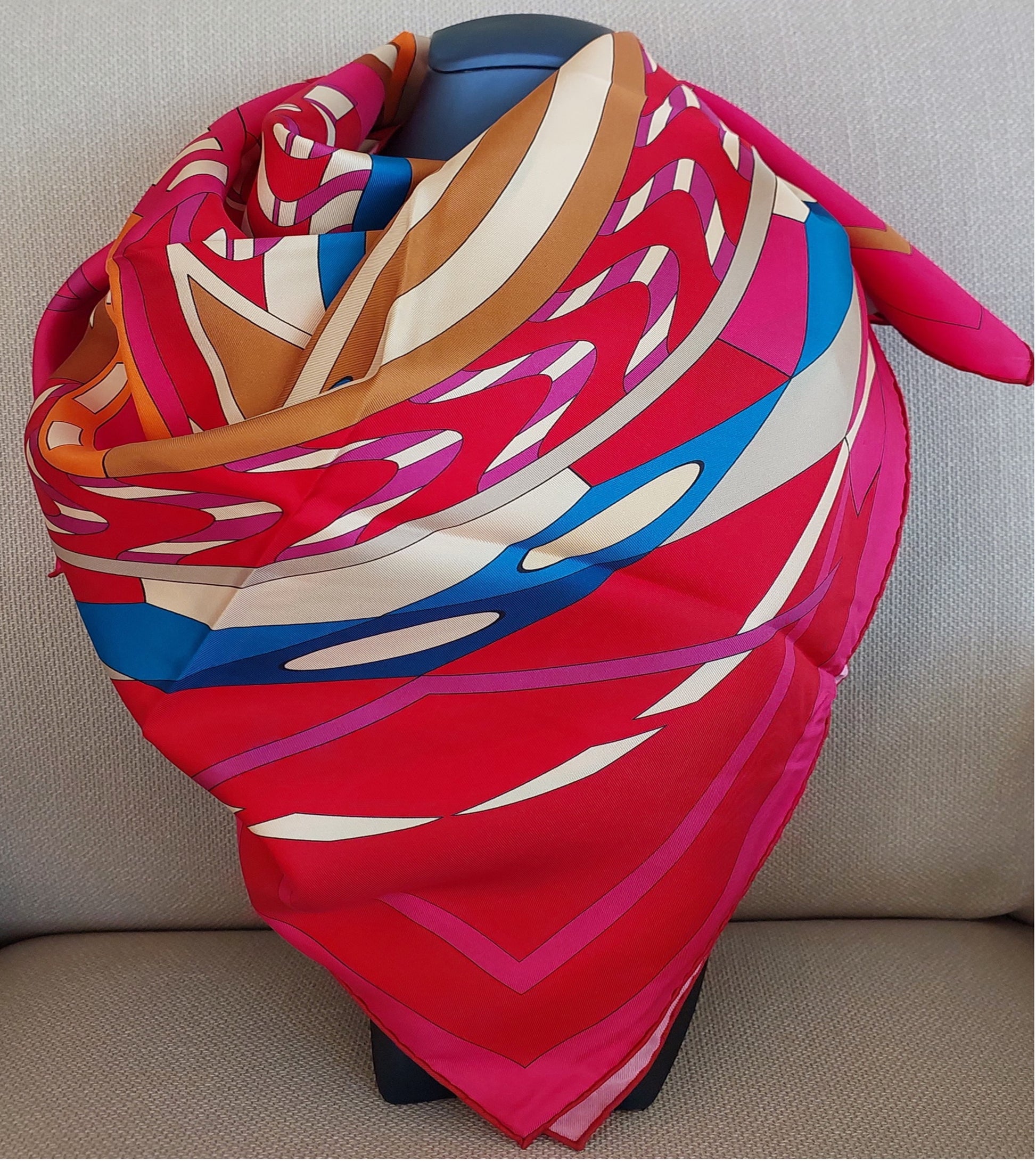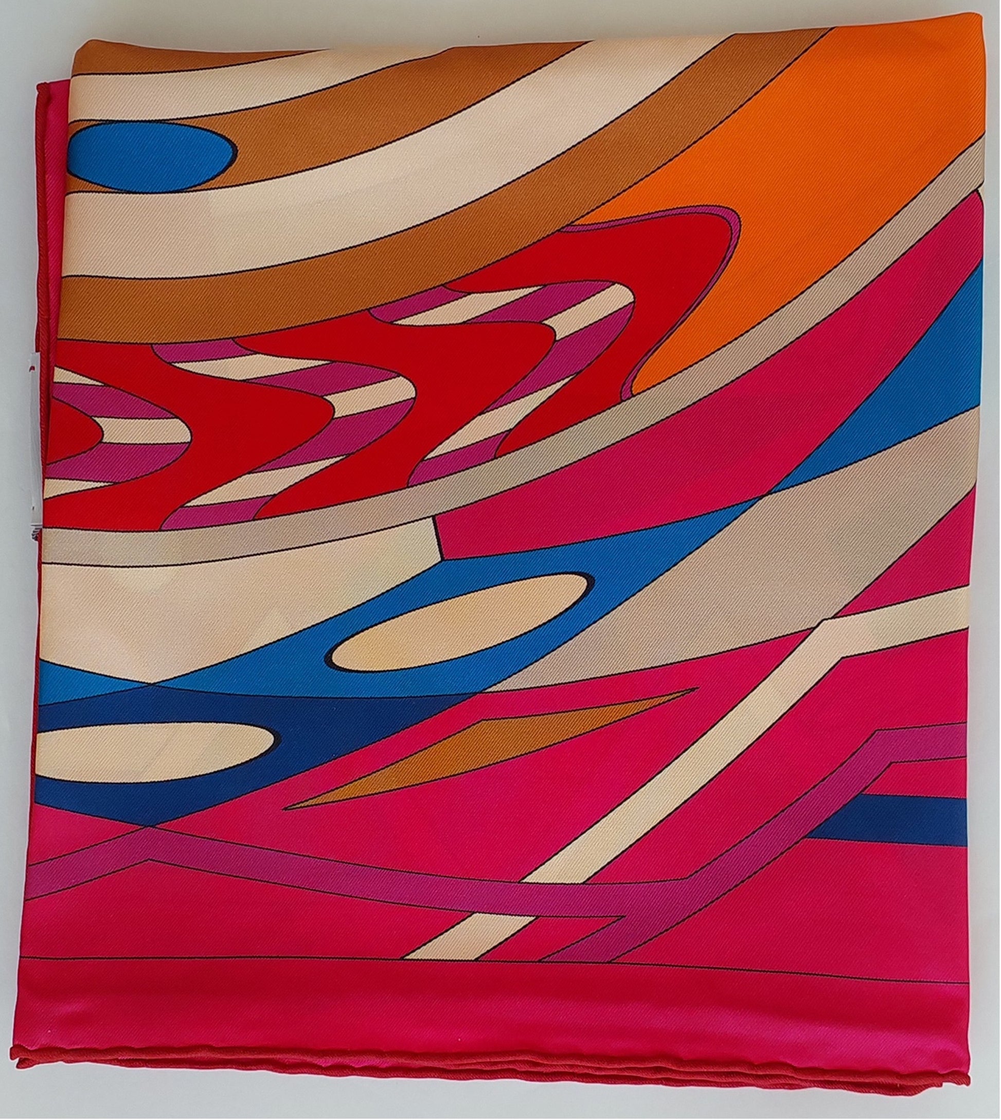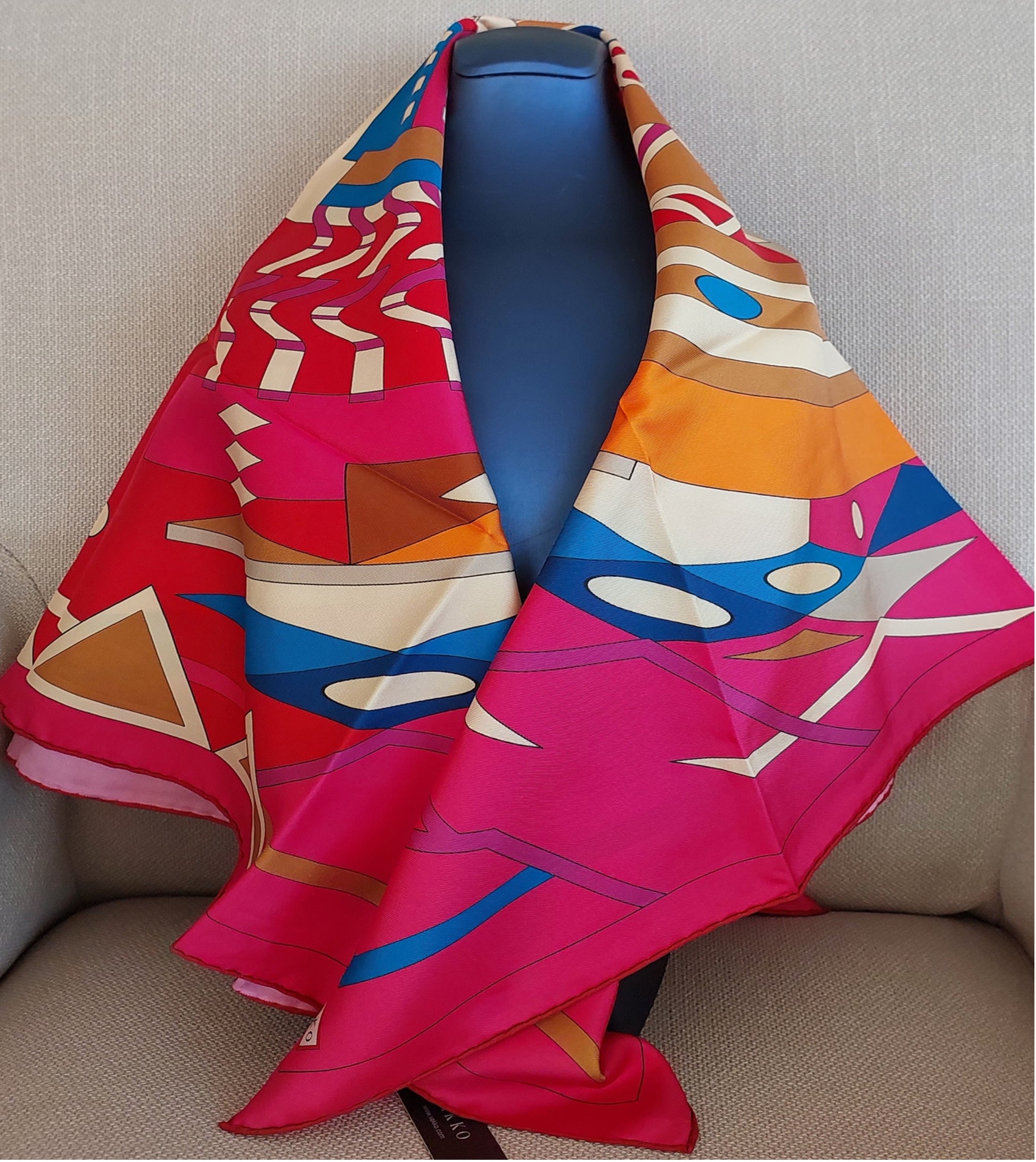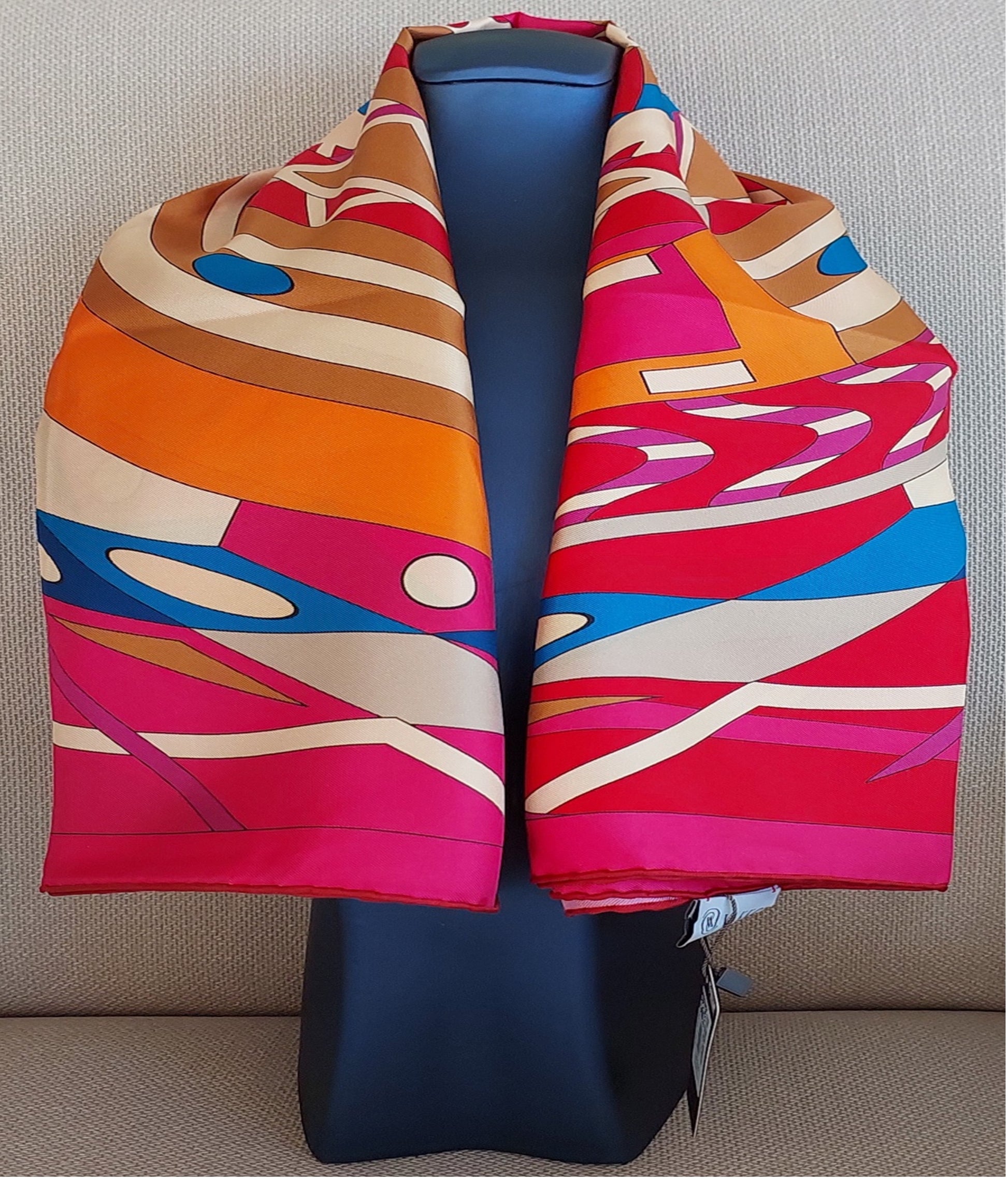 Woman 100% Silk Scarf Geometric design Circles Fuchsia Red Blue Colours Hand Rolled Edges Designer Style Great Gift for Her in a box