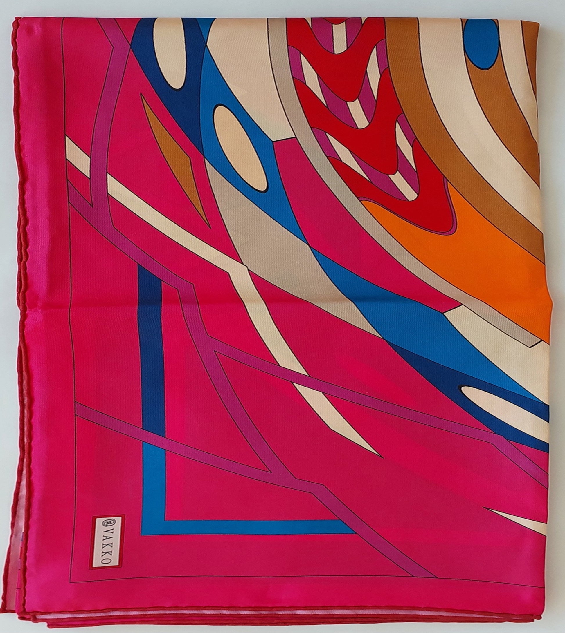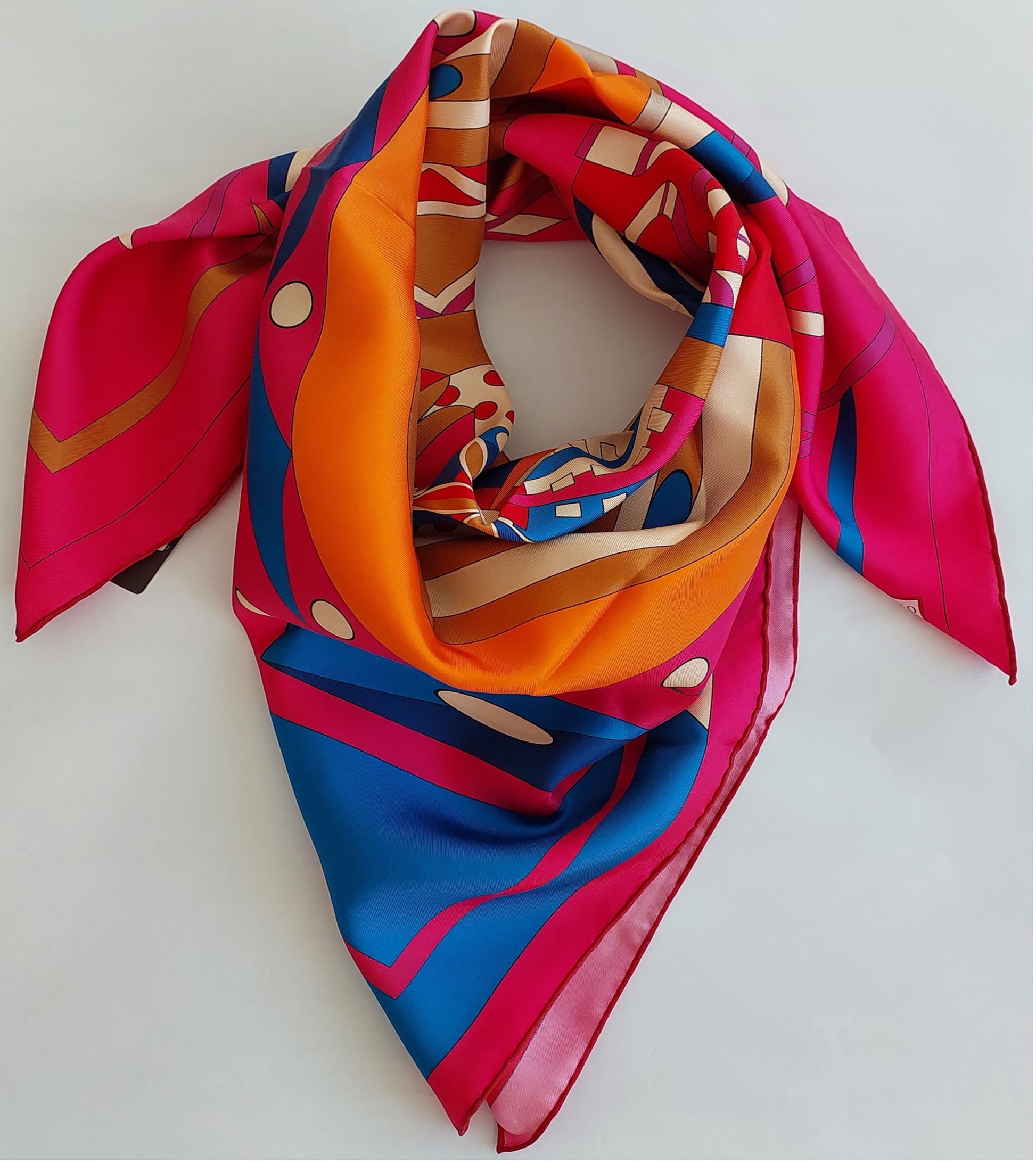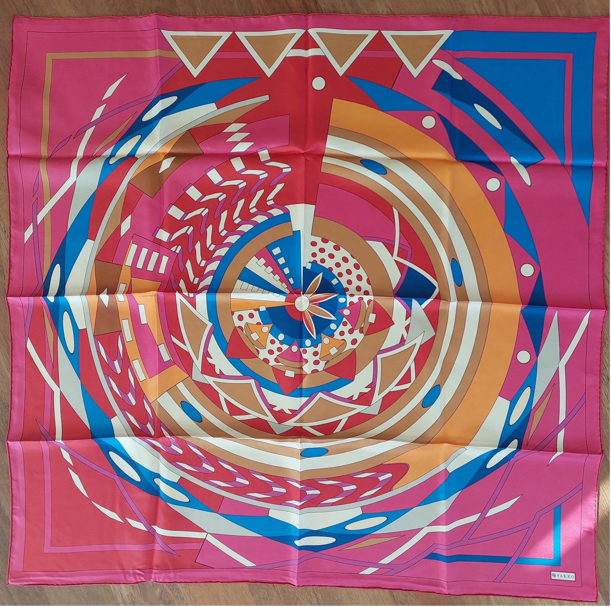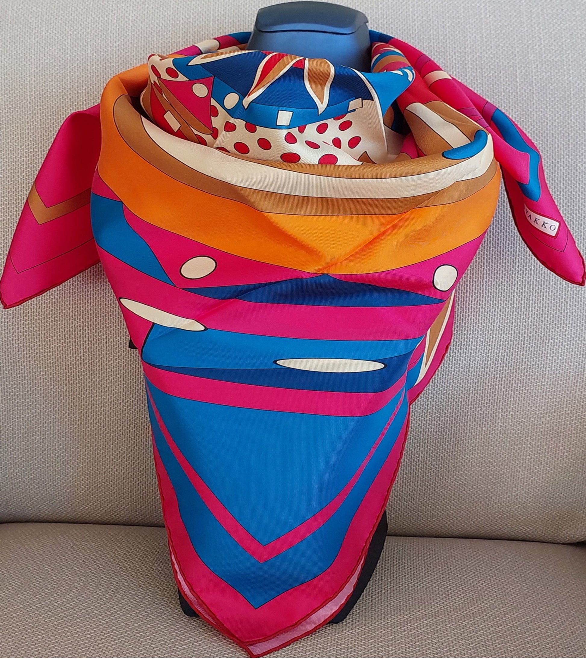 A Beautiful Silk Scarf made with very high quality 100% Silk fibres designer style ,Carré de soie scarf format is light and easy to wear with geometric circles design made by the house of Vako .Made of the best quality silk. It is a rare ,timeless, elegant scarf, in which woven twill meets special hand table printing, made with the highest level of hand craftsmanship "A la Lyonnaise", fine hand-stitching detail ,hand-rolled stitch edges packed in an elegant box .The dimensions of this scarf are: 90 x 90 cm (35 inch x 35 inch) weight around 65 grams. In a gift packaging box